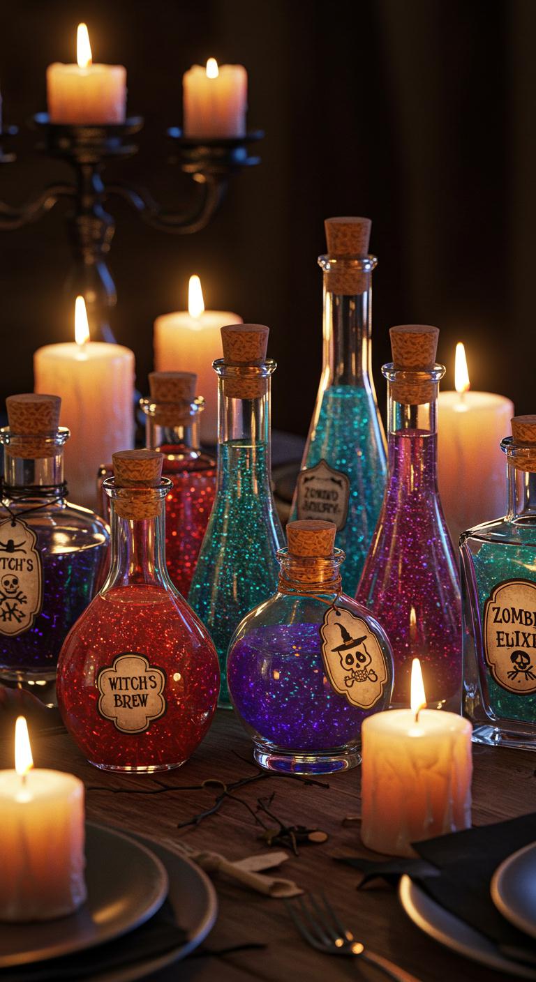 Potion bottle centerpieces can instantly elevate a Halloween gathering, transforming an ordinary table into a spellbinding scene.
