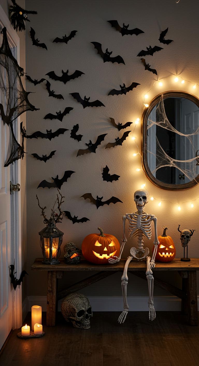 Imagine a wall adorned with black bats, fluttering silently against the backdrop of spooky lighting. A rustic bench showcases a skeleton cradling a glowing pumpkin, while cobwebs drape from a curved mirror, enhancing the eerie ambiance.