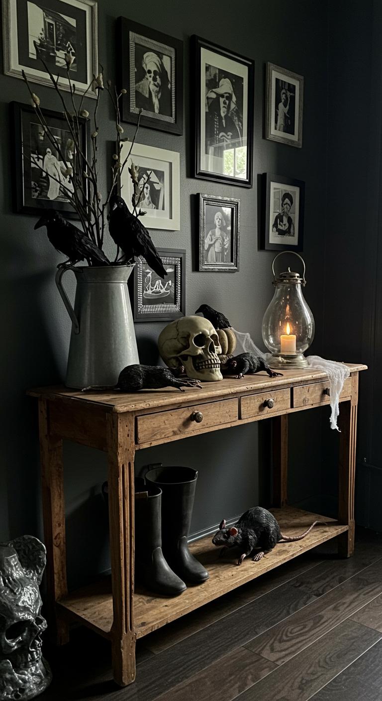 What elements come together to create an enchanting black and white spooky entryway? Picture an antique console table draped with haunted accents like a skull and crows perched in a grey jug. Dim lighting casts eerie shadows, while a vintage glass lantern flickers beside a crawling rat, setting a chilling tone. Framed black-and-white Halloween photos line the walls, enhancing the atmosphere. Matte black decor envelops the space, creating a striking contrast against ghostly whites. This innovative design beckons guests to step into a world of fun fright, proving that simplicity can evoke a hauntingly beautiful charm.