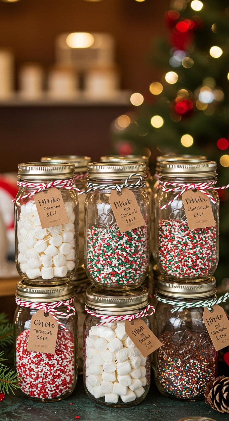 Put together a hot chocolate kit for a delicious and cozy gift. Use mason jars to layer cocoa powder, mini marshmallows, and crushed peppermint. Decorate the jar with a tag for easy gifting. This is a simple yet thoughtful project! You can create several kits for under $20, making it an affordable option for friends and family.