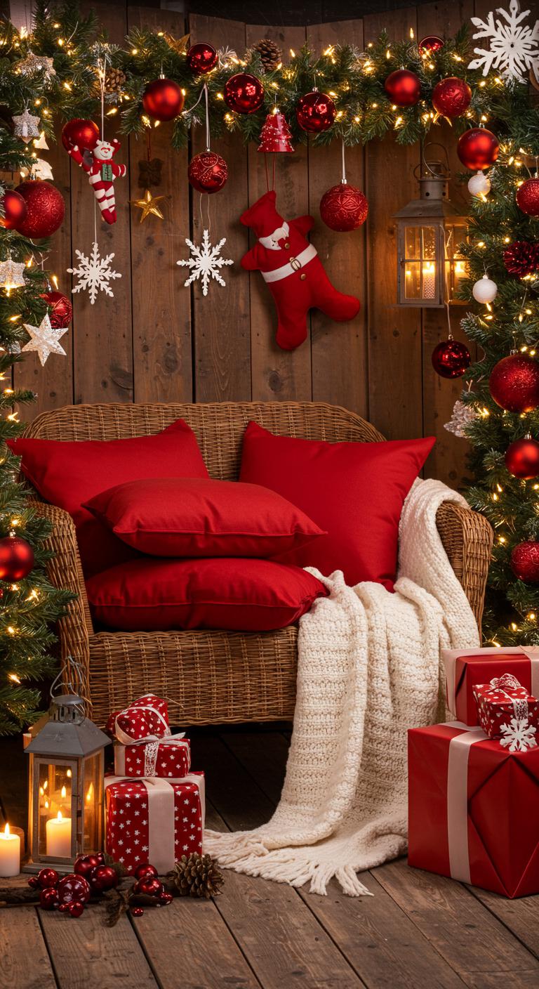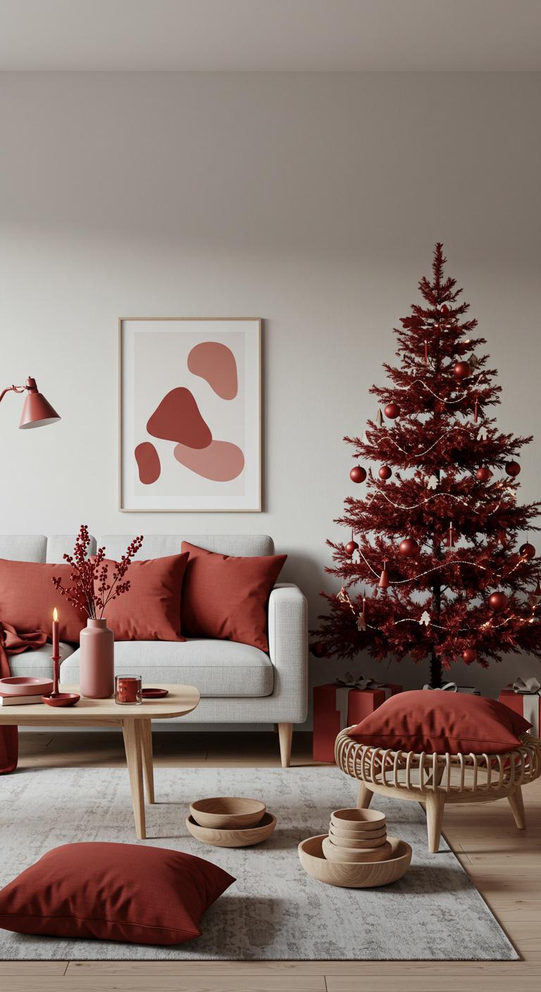 Integrating soft browns and whites into your red-themed decor creates a cozy, inviting atmosphere. Think of a wooden mantel adorned with red poinsettias and white candles. You can use neutral fabric accents like burlap or linen for table runners. Decorate with wooden ornaments or rustic decorations that complement the red. This look embodies a warm, organic vibe. It’s budget-friendly; consider DIY wooden decor to add a personal touch. Gather branches and paint them festive red for instant charm!