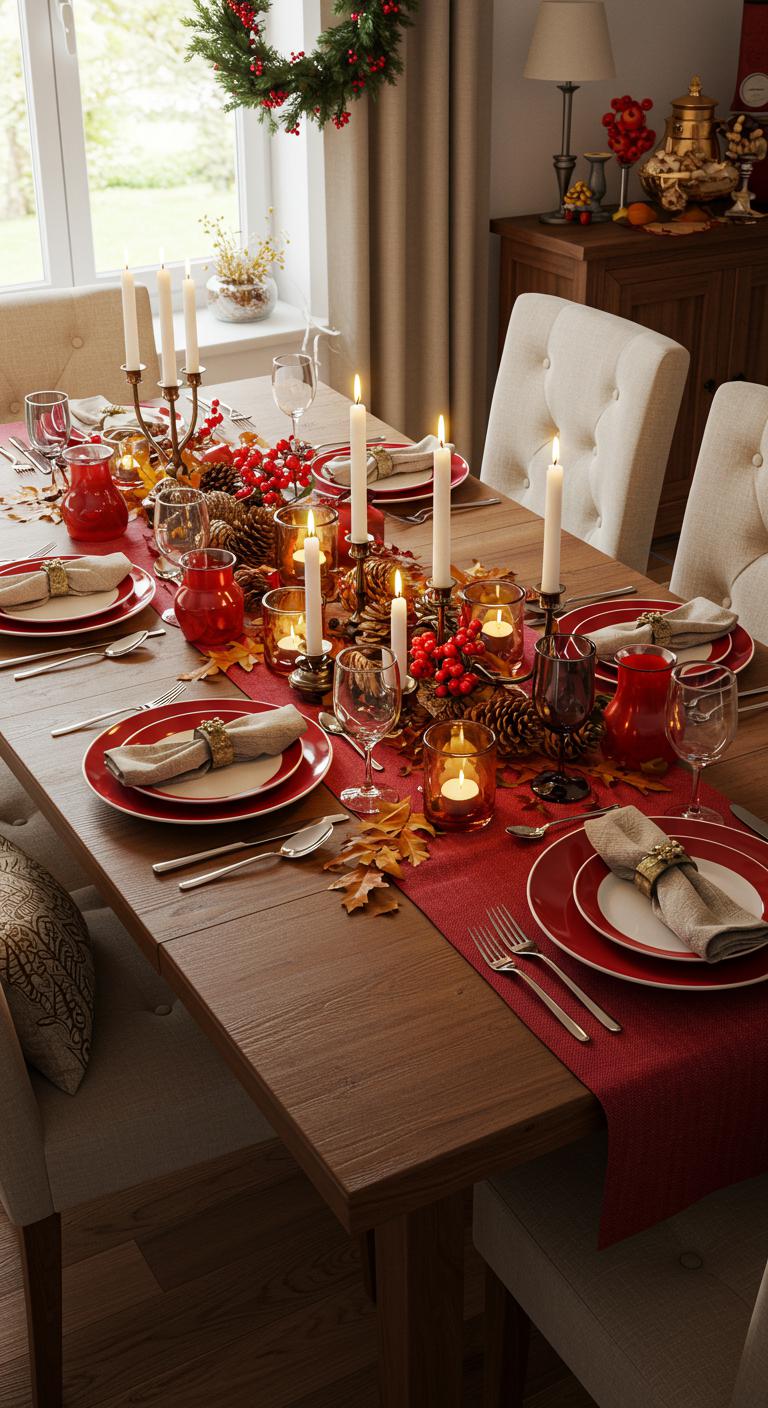Using autumn colors within your red-themed decor can ease the shift from fall into the festive season. Shades of burnt orange and muted red blend seamlessly together. To implement this, consider using red leaves and rustic pumpkins on your dining table or mantle. Layered table settings that incorporate these shades will beautifully highlight the transition. This idea is budget-friendly; shop for decor during fall clearance sales to find suitable pieces. This keeps your home stylish as the seasons change.