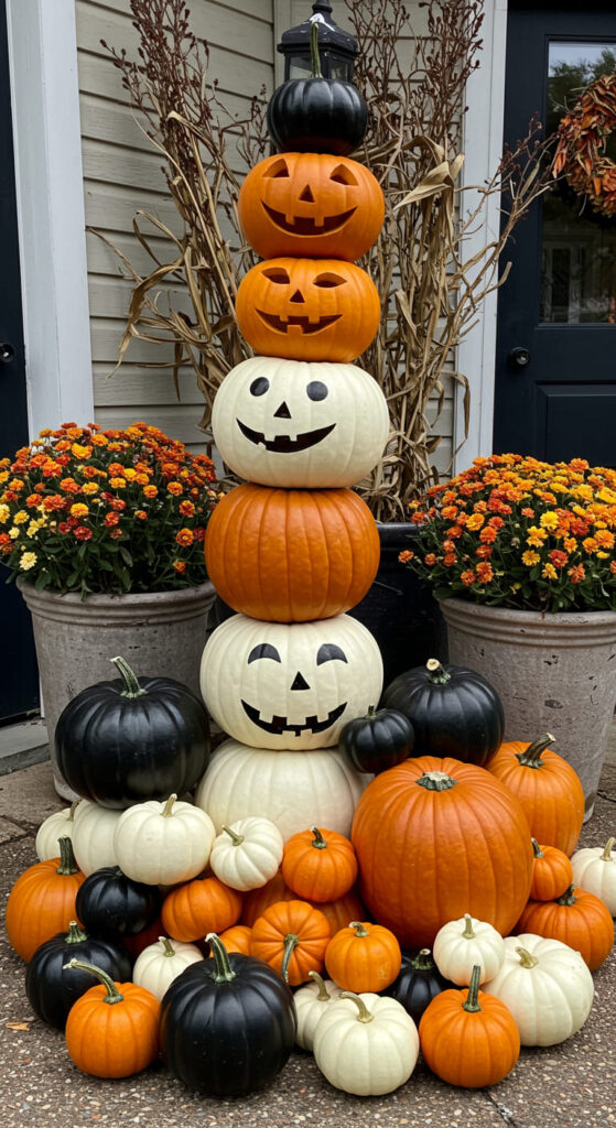 From towering pumpkin focal points to clusters of various colors—think whites, blacks, and vibrant oranges—creativity flourishes.