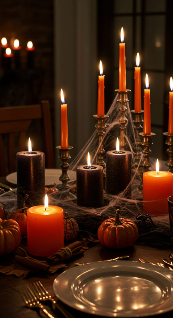 Innovative arrangements of black candles nestled within faux spider webs create a moody focal point, while flickering orange candles infuse dining spaces with seasonal warmth.