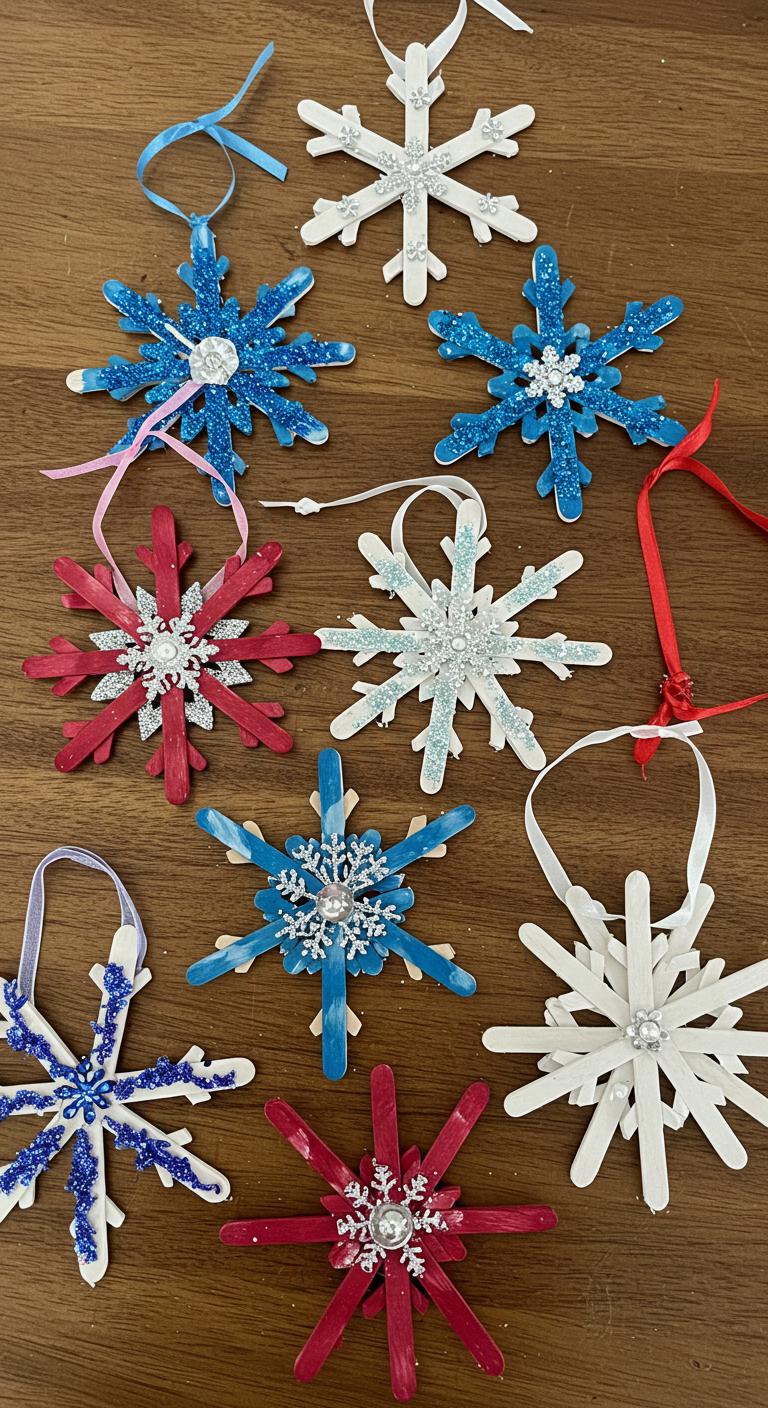 Use popsicle sticks to create stunning snowflakes! Arrange and glue sticks into different formations. Choose your favorite colors for painting before adding glitter for sparkle. Attach a ribbon loop for hanging at the top. This fun activity also encourages kids to be creative with designs. Use leftover sticks for other holiday crafts, ensuring minimal waste. These snowflake ornaments look charming on any tree or window.