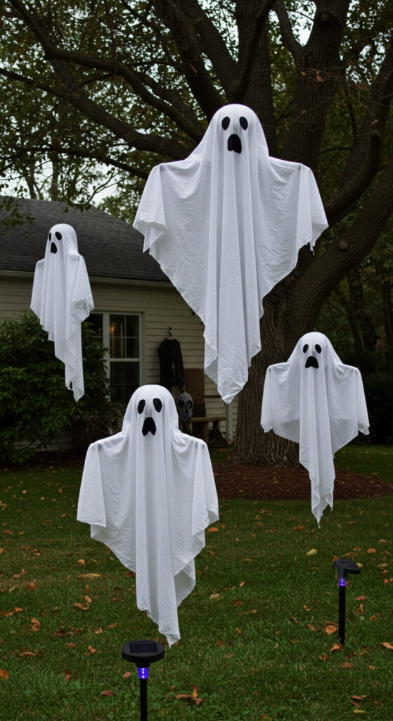 Floating cheesecloth ghosts drift through the air, lending an enchanting and whimsical touch to Halloween yard displays.