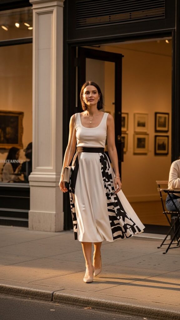 When you want an outfit that reads polished but effortless, pair a high-waisted midi skirt with a fitted top to balance shape and movement.