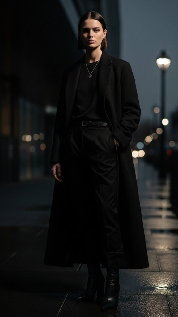 You’ll command rooms with shadow tailoring and sleek noir layering, choosing clean lines, matte textures, and liberated movement.
