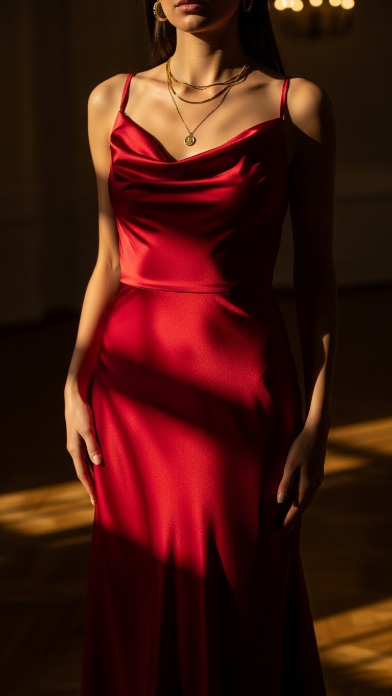 If your evening calls for full glamour, a red satin gown commands the room while keeping your accessories refined. You’ll choose minimal gold jewelry to accentuate your silhouette—delicate hoops, a slim chain, a signet—practicing subtle jewelry layering for depth without clutter. Mind satin maintenance: steam, gentle storage, and avoid snagging to preserve that liquid sheen. Wear it confident, effortless, and unapologetically free.