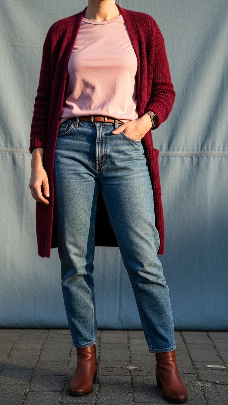 Against a backdrop of easy denim, pink and burgundy make a smart, unexpected pair that reads both romantic and grounded. You’ll master pink layering with a soft tee and burgundy cardigan, then throw on relaxed jeans to create striking denim contrast.