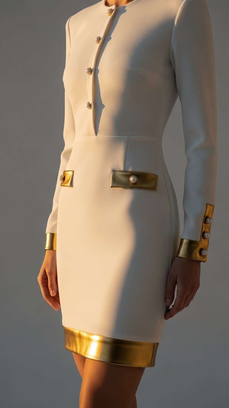 When you slip into a white bodycon dress, it signals a fresh start—clean lines and a close fit let the gold accents do the talking, turning minimalism into ceremony. You choose freedom: a gold trimmed hem, clean tailoring that flatters your movement, soft matte fabric that feels deliberate, and pearl buttons as quiet punctuation.