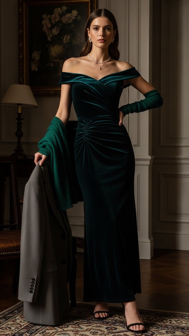 If you loved the effortless romance of blush silk, bring that same softness into winter with a velvet off-shoulder gown and strappy heels. You command the room in luxe drape; choose deep jewel tones and minimal jewelry. Follow velvet care to protect pile, and use smart layering tips—think a fitted cashmere shrug or tailored coat—to stay warm without losing silhouette freedom.