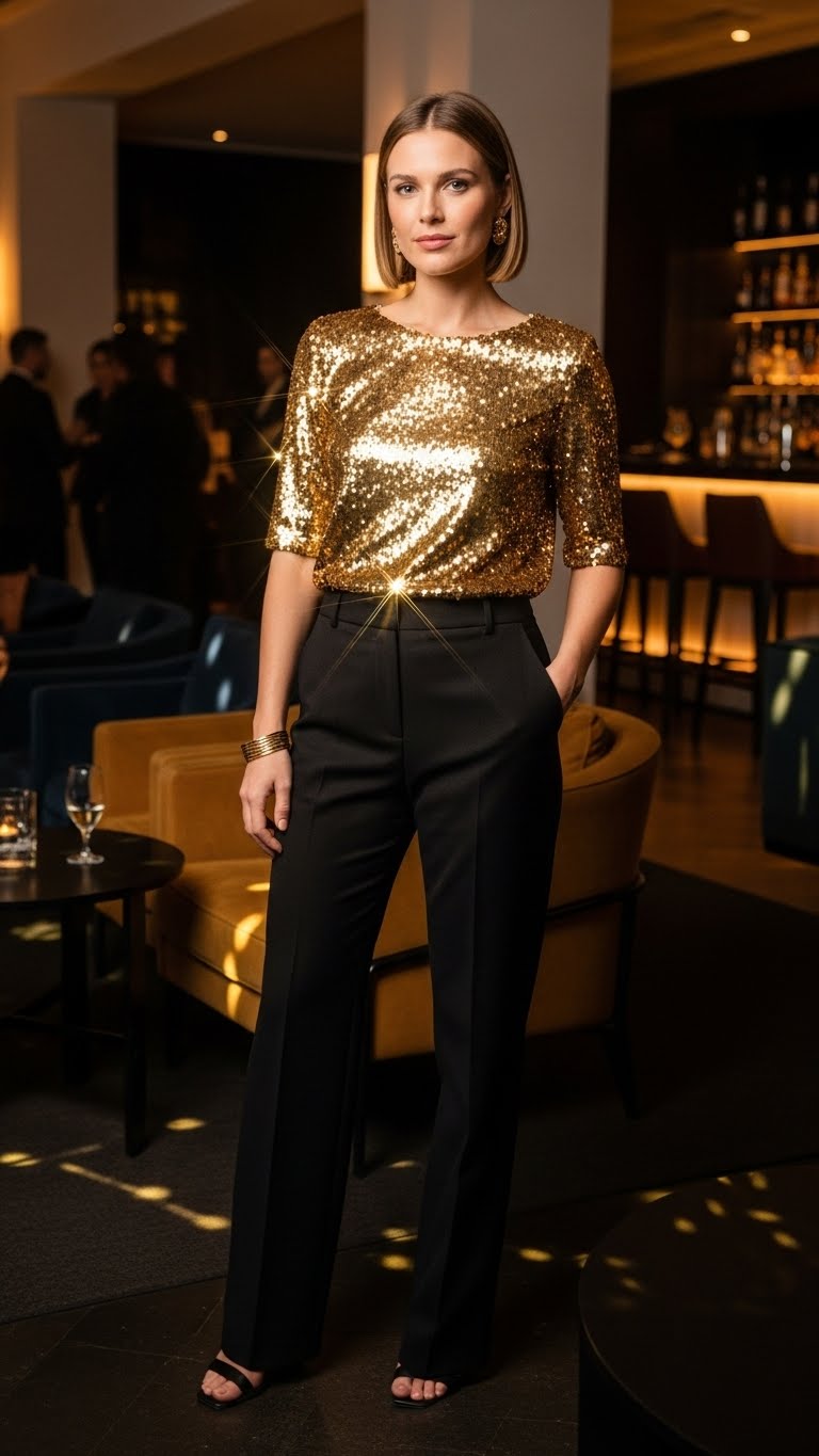 Turn heads in a gold sequin top paired with black tailored pants—it’s the perfect balance of bold sparkle and sleek structure for a party.