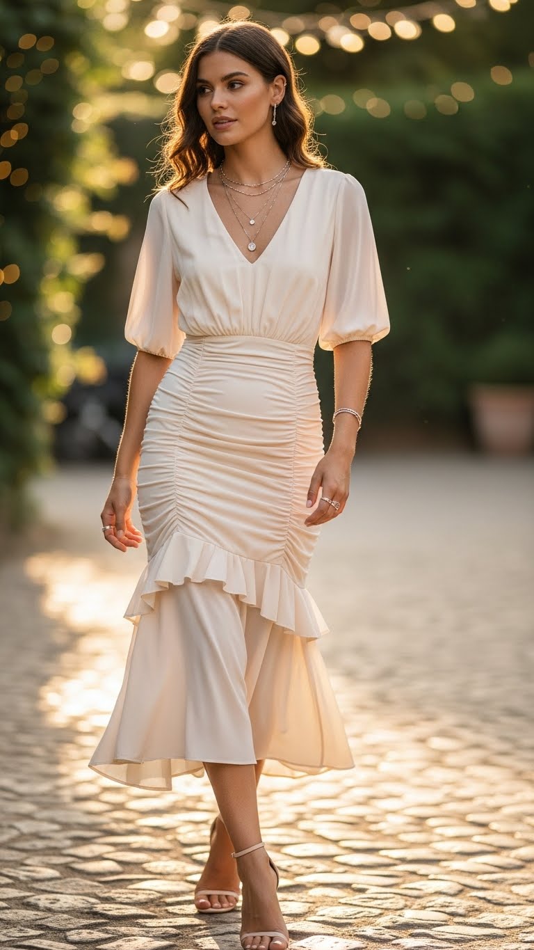 If you loved the sculpted, waist-defining lines of a bustier and ruched skirt, soften the mood with a ruffle-hem romantic dress that still flatters your silhouette but reads more whimsical and feminine. Choose a ruffle silhouette that moves when you walk, pair with delicate jewelry and delicate layering to keep the look airy yet intentional—effortless, confident, and free.