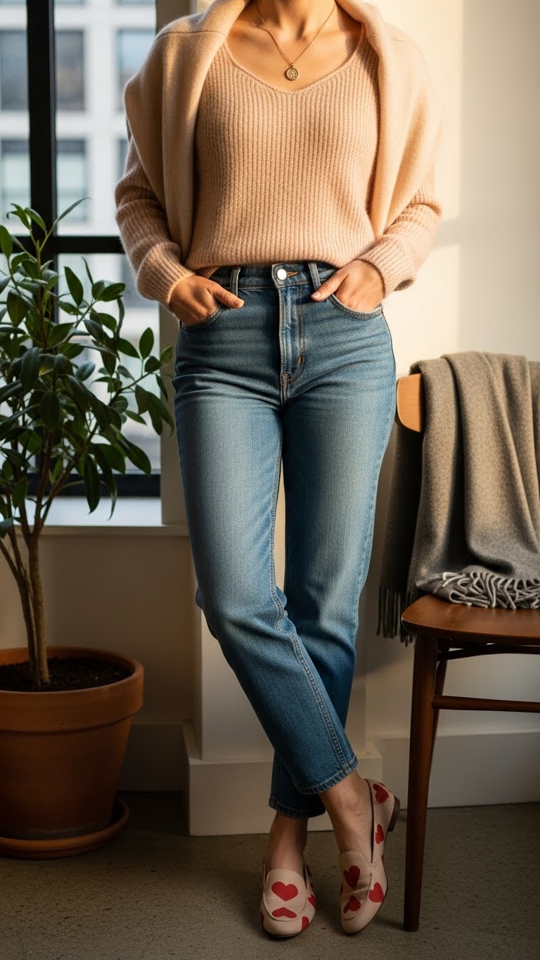 You’ll add a lightweight cashmere shrug for warmth and effortless polish, tuck jeans neatly, and choose heart print loafers to nod to the occasion without fuss.