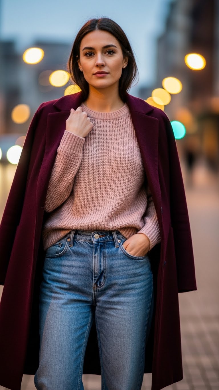 With a burgundy coat thrown over a soft pink sweater and relaxed denim, you’ll strike a chic balance between warmth and ease.