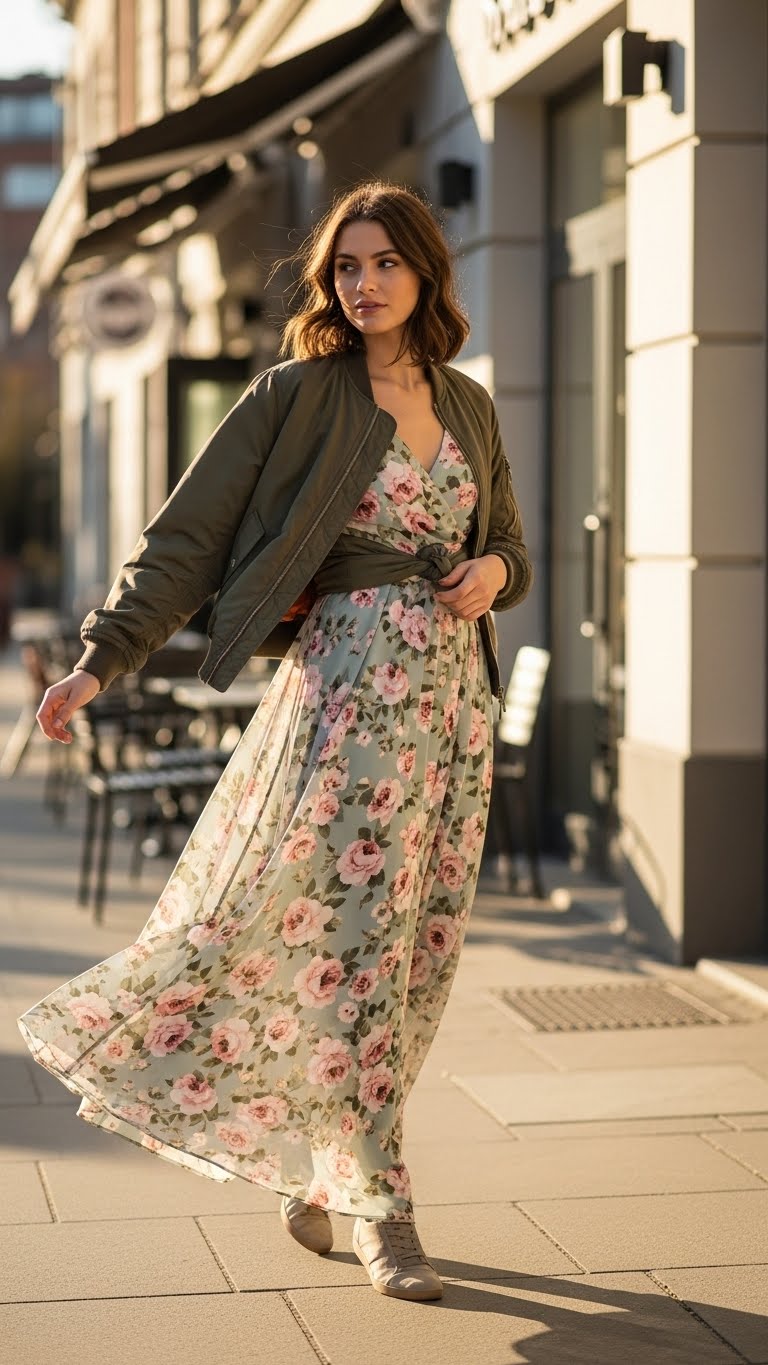 Pair a lightweight bomber with a flowing floral maxi to give a romantic dress a relaxed, street-ready edge. You’ll embrace floral layering while keeping movement effortless; knot the bomber or leave it open to show prints.