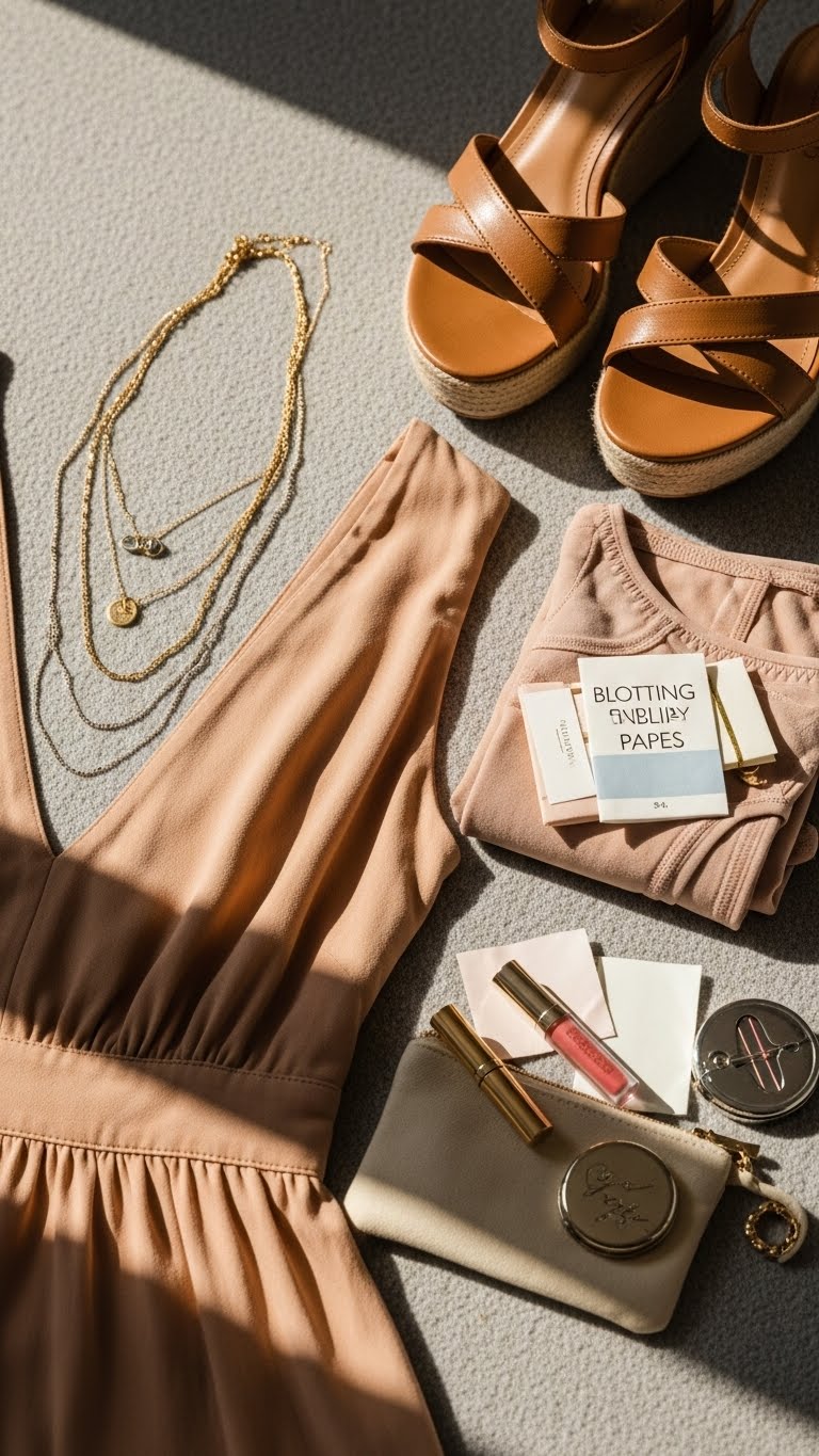 Carry compact touchups—blotting papers, mini gloss, and a discreet sewing kit.