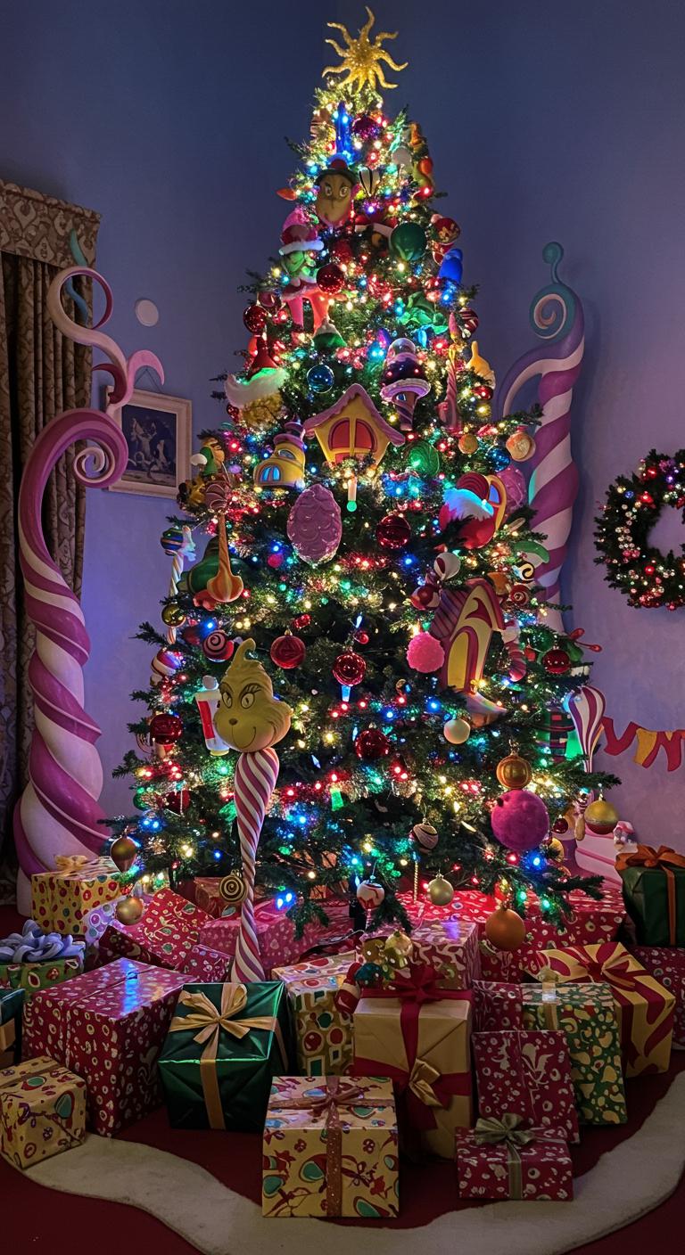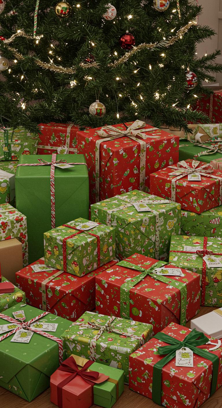 Decorate your tree base by making gifts an extension of your decor. Use Grinch-themed wrapping paper for a cohesive look. Get creative with mismatched ribbons and embellishments. Use tags that feature Grinch characters, adding charm to each present. To keep it affordable, consider wrapping boxes in craft paper and decorating them with Grinch stickers or drawings. It’s a fun way to involve your kids in decorating while staying on budget.