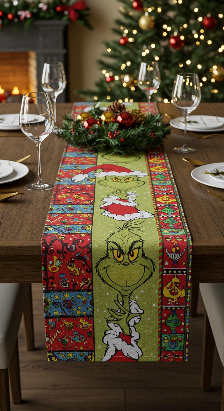 Add a crafty touch to your holiday table with a DIY Grinch table runner. Use green fabric as a base, then add red accents with paint or fabric markers. Draw or stitch whimsical designs inspired by the Grinch. This budget-friendly decoration allows for personalization with family members’ handprints or signatures. Not only does it bring the holiday spirit to your dining experience, but it also adds an entertaining element guests will enjoy!