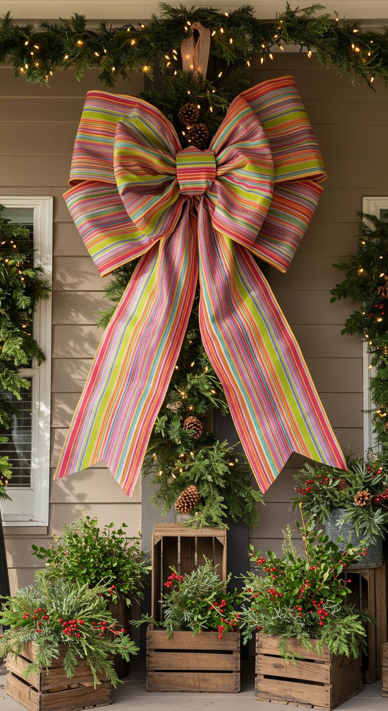 Make your décor pop with oversized striped bows. These bold statements can be used on trees, garlands, and even doorways. Simply choose vibrant, festive colors that fit your theme. To create your own, grab some wired ribbon and cut it into lengths for looping. Super simple, right? Just stack the loops, wire them together, and fluff them up. Attach these bows to existing decorations for a touch of whimsy. They’re affordable, playful, and sure to delight your guests!