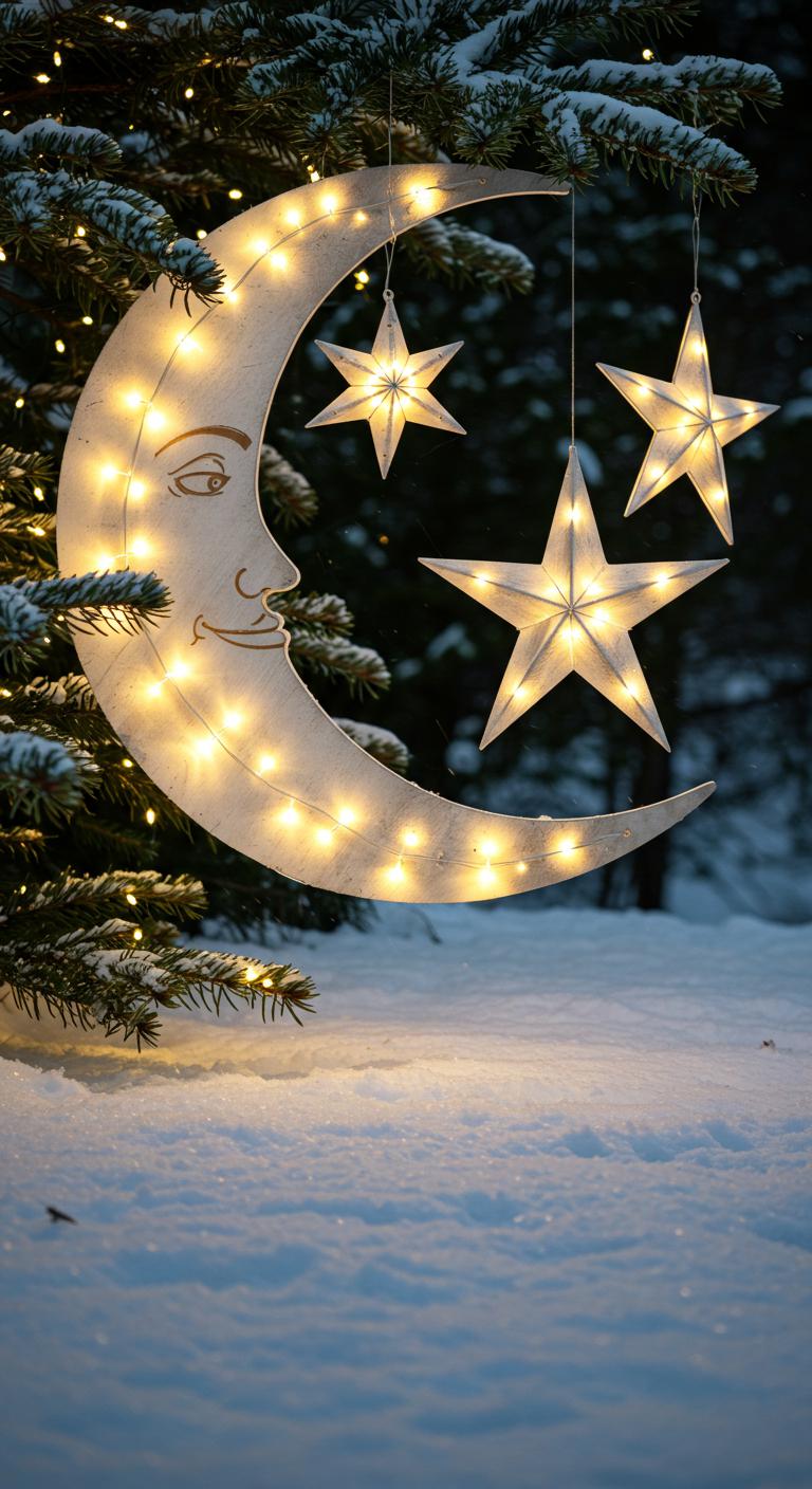 Explore celestial motifs to add a fresh twist to your outdoor decor. Stars, moons, and other heavenly body designs can easily find a home among your other decorations. Consider hanging wooden stars or moon shapes, lit up with fairy lights. Create a constellation by stringing smaller decorations up into a visually cohesive design. These enchanting nighttime elements will give your space a magical quality that you and your guests will adore.