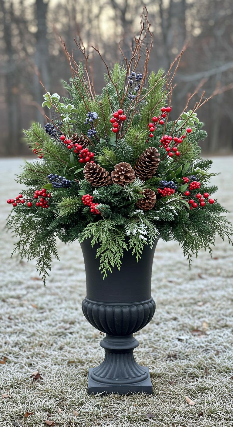 Fill outdoor urns with seasonal greenery for budget-friendly decor. Start by gathering pine branches, leaves, and winter berries from your yard. Arrange them artfully in your urn, placing larger elements at the back for depth. You can add ornaments or ribbons to enhance the festive feel. This stylish centerpiece showcases your creativity while complementing other yard decorations. Plus, it can be done quickly for a last-minute touch!
