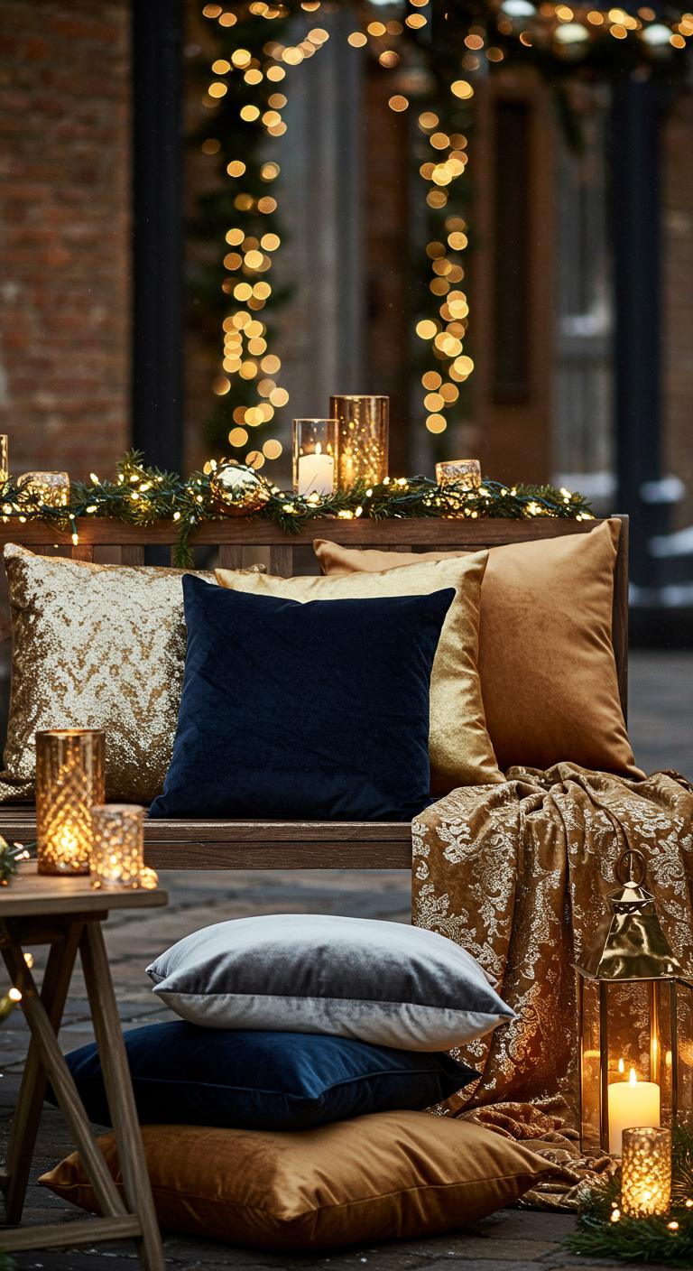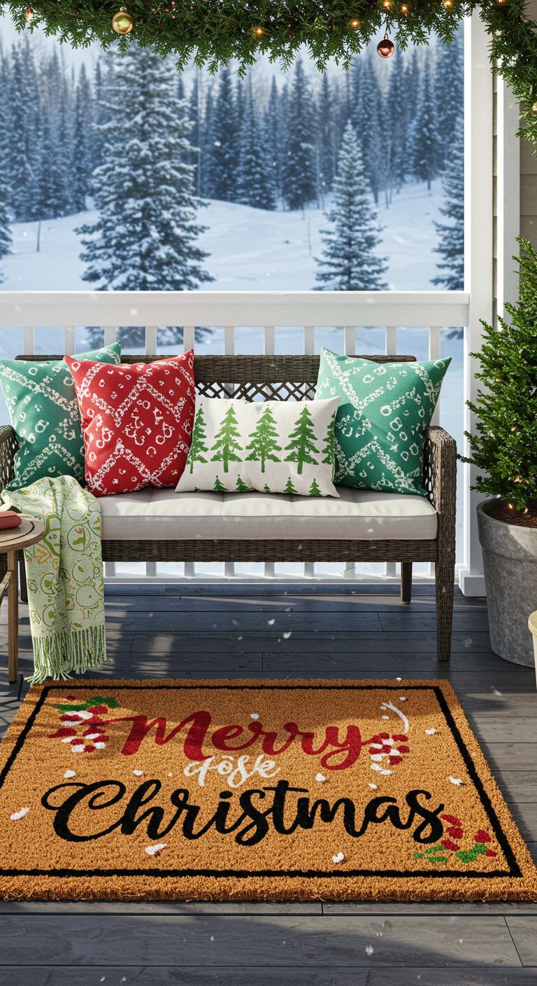 Add comfort and color to your outdoor seating with festive pillows and doormats. Choose brightly colored designs to create a welcoming atmosphere. If you’re crafty, consider decorating plain pillows with fabric paint or stencils for unique creations. Search for doormats that reflect your festive spirit. This easy addition enhances your outdoor area, encouraging people to gather and enjoy the warmth of the season.