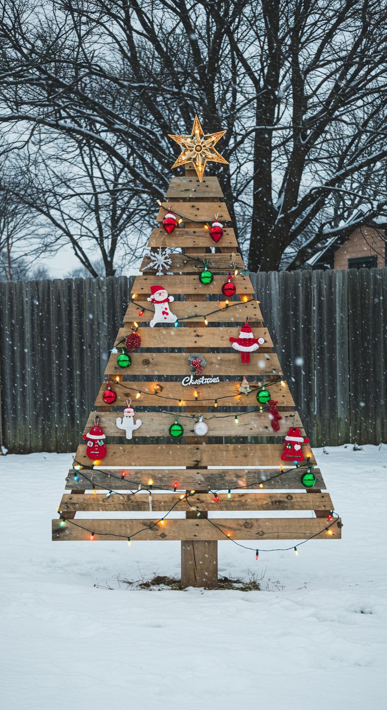 Consider making a pallet wood Christmas tree for a sustainable yet whimsical display. All you need are some wood pallets, which can often be found for free or very cheap. Cut them into a tree shape, then paint or stain to your liking. Decorate with lights, ornaments, and even hand-painted signs for a personal touch. These trees are customizable and can fit into any outdoor space, proving that festive doesn’t have to mean expensive!