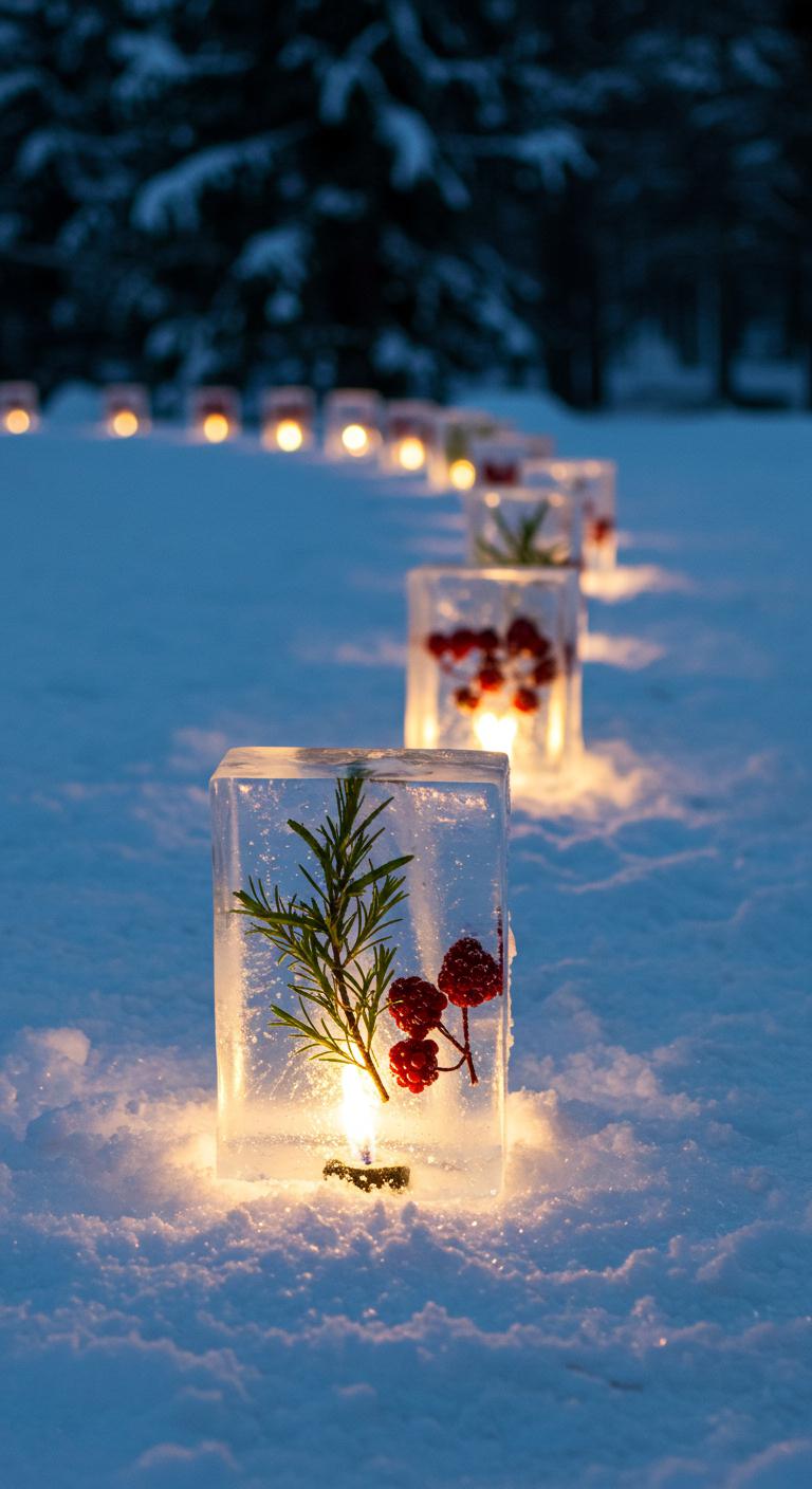 Bring a unique touch to your decor with ice luminaries and frozen ornaments. Start by filling containers with water, berries, or greenery, then freeze them overnight. Once frozen, pop them out, and place them outside where the light can catch them. Consider adding tealights inside for extra glow. These stunning, icy displays melt away, but they leave a beautiful impression while they last.