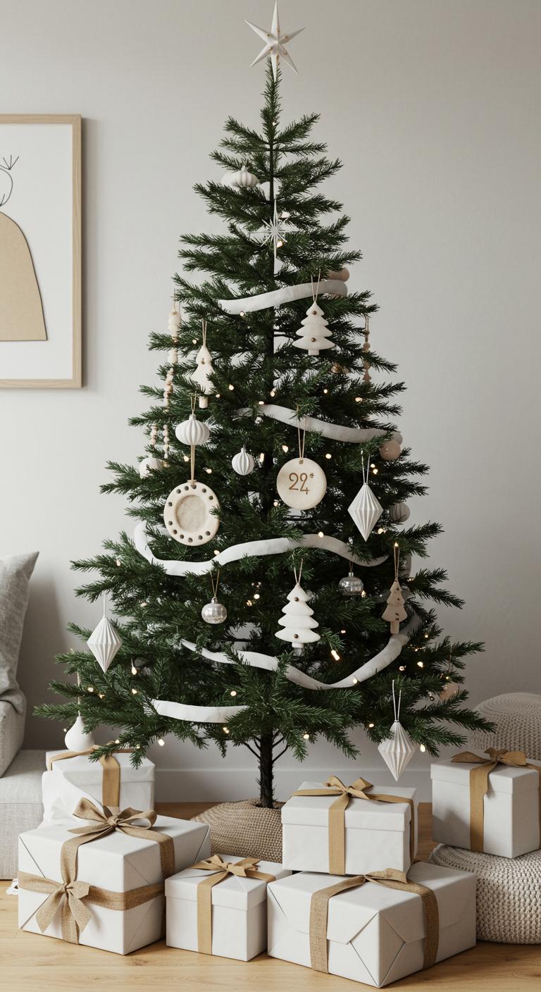 Embrace the serenity of Scandinavian decor by mimicking its minimal design principle. A Scandinavian-inspired Christmas tree focuses on simplicity, using geometric shapes in white and natural wood. Opt for handmade ornaments to add a personal touch. Use a mix of textures like felt or wool to create visual and tactile interest. Budget-friendly DIY options could include crafting your own ornaments from recycled materials, giving a charming rustic touch to your tree. Don’t forget the ambient lighting; soft white lights will enhance the glow of your minimalist theme.