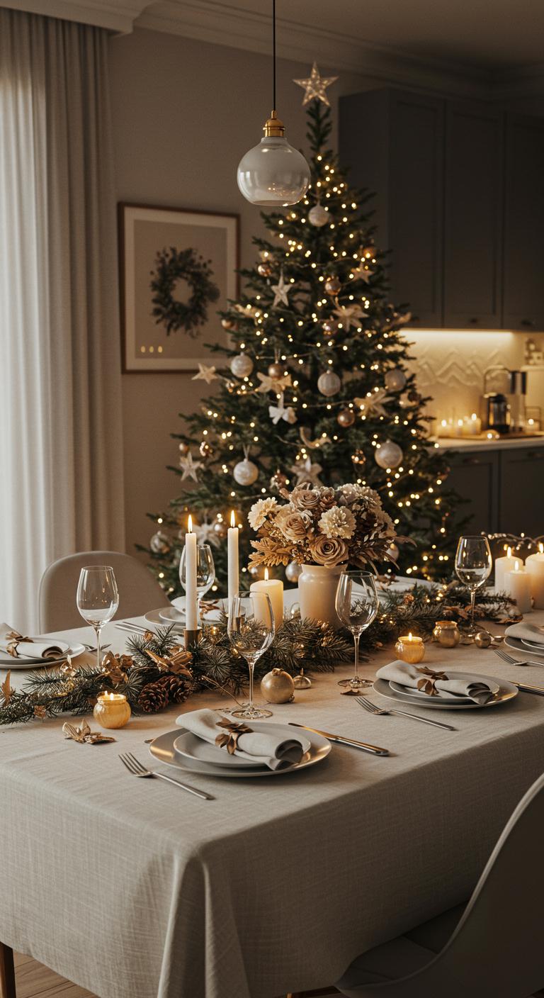 Integrate your Christmas decor into table settings for cohesive styling throughout your home. A neutral palette can create an elegant dining space. Use the same colors and textures from your tree in table linens, plates, or centerpieces. Choose simple glassware or wooden accents that match your tree’s theme. Incorporate natural elements like herbs or simple floral arrangements for an inviting touch. It’s an easy way to extend your holiday spirit into every room.