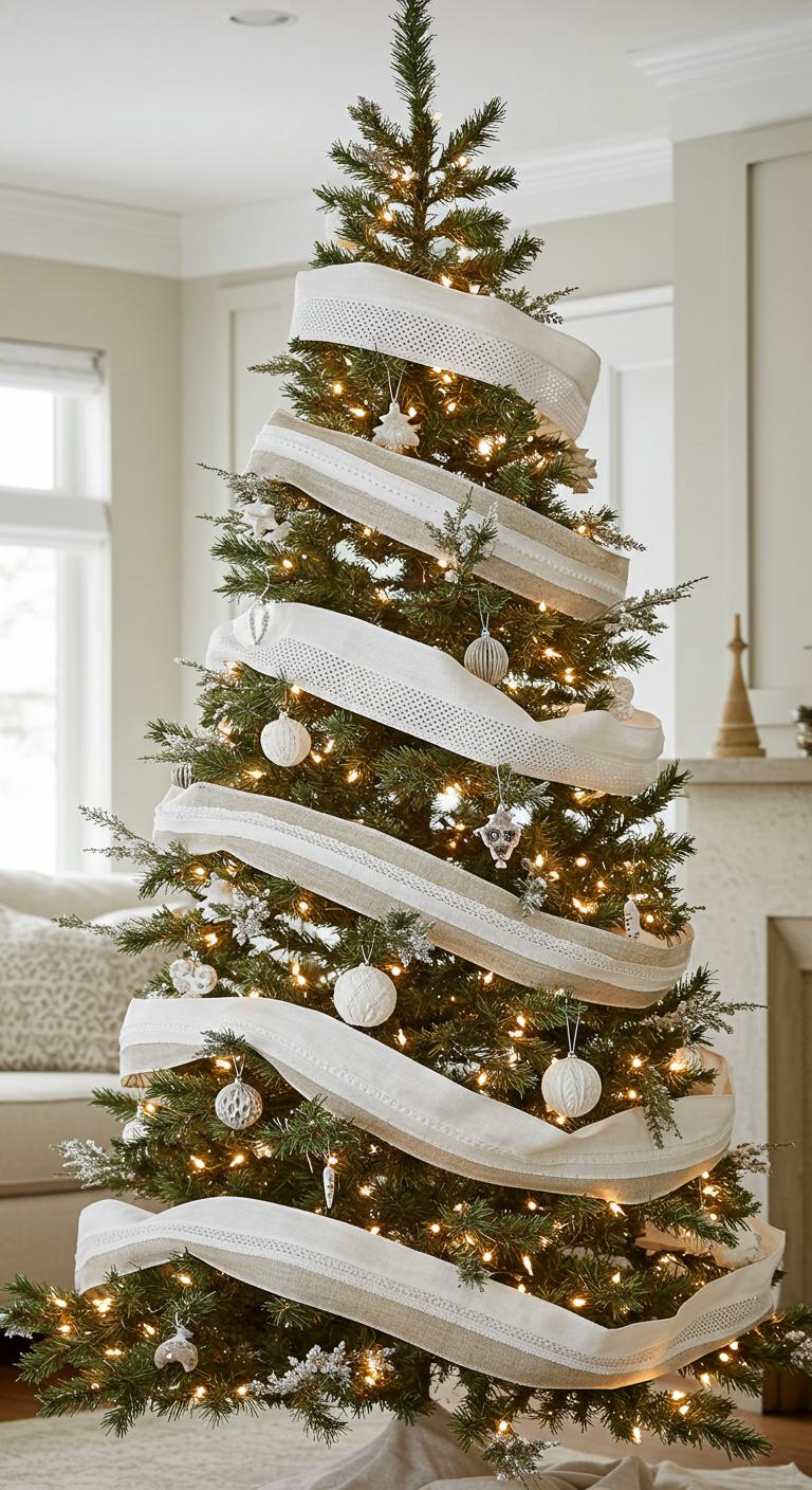 Textured elements are essential in crafting a stunning neutral tree that doesn’t look flat. Mix various materials like glass ornaments, ceramic figures, and fabric accents. For a budget-friendly approach, consider making ornaments from felt or upcycling old decorations. Use soft ribbons to add depth and movement; cascading white ribbons can look chic and playful. Incorporate oversized decorative pieces for focal points. Aim for a variety of finishes to keep the eye engaged, creating a layered and sophisticated look among the whites and neutrals.