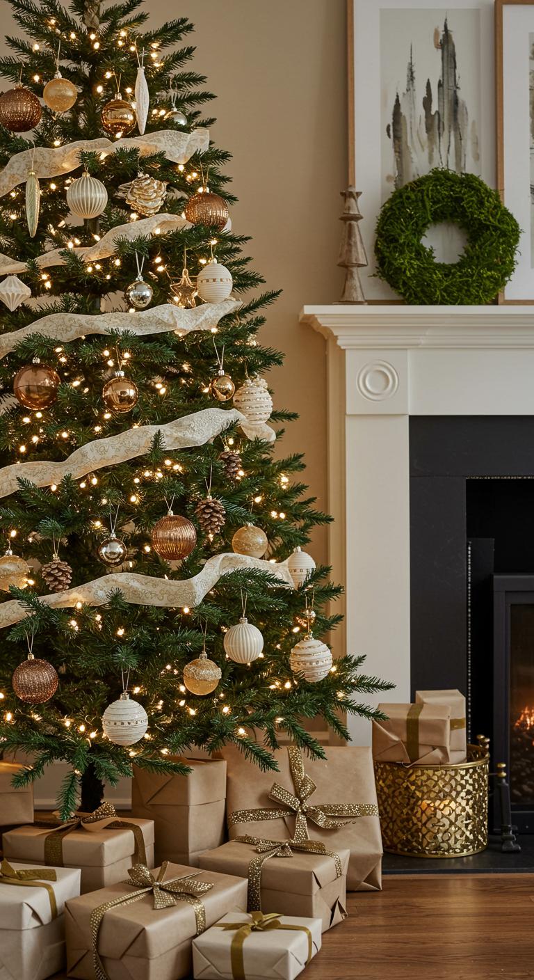Infuse warmth into your neutral Christmas tree with soft metallics like gold or copper. These elements add sophistication while maintaining an inviting atmosphere. You can create your metallic accents using budget-friendly spray paint on cheaper ornaments or by purchasing metallic ribbon to weave throughout your tree. This contrast with white will pop beautifully and bring a touch of luxury. If you’re a fan of DIY, try wrapping pinecones in metallic paint for unique ornaments that tie into your theme without costing much.